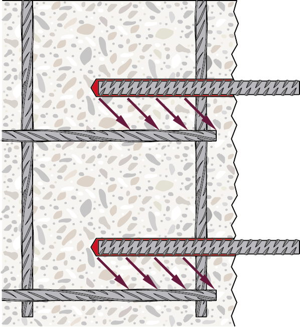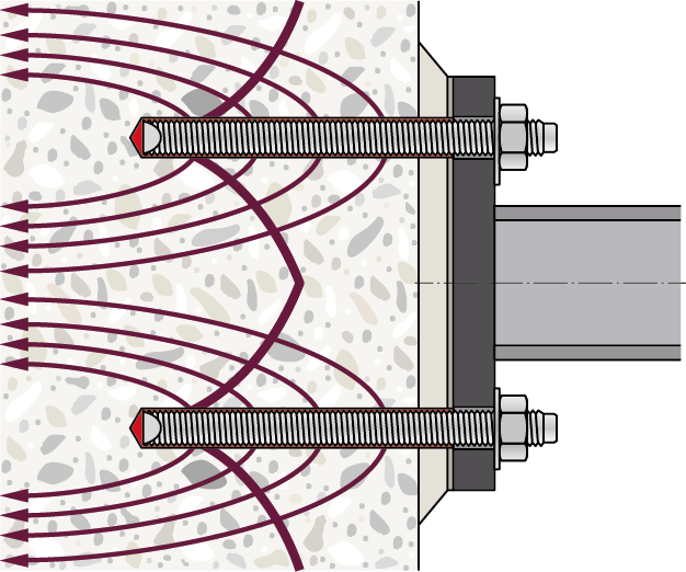 在錨栓理論中,來自鋼構件(梁或柱)的荷載通過錨固定在混凝土上的錨板傳遞到混凝土結構上。固定件的鋼構件(粘合劑的螺紋桿)通過拉伸荷載或剪切荷載或兩者的組合將荷載轉(zhuǎn)移到現(xiàn)有混凝土構件上。利用混凝土的固有抗拉強度是加固抵抗荷載的必要條件,這意味著脆性混凝土錐體破壞在錨栓理論設計中是可以接受和考慮的。